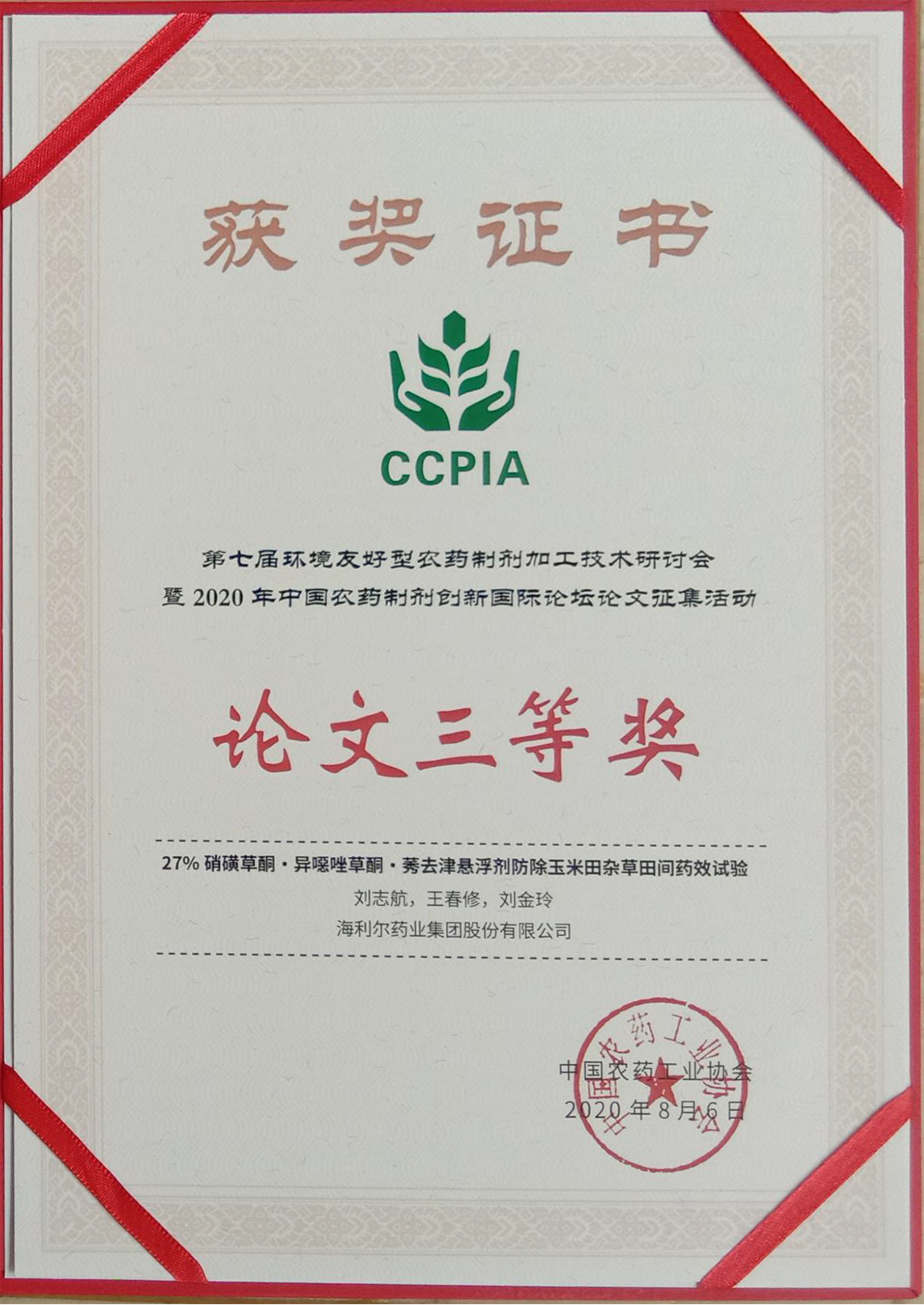? ? At the same time, in order to promote agricultural industry cooperation and achievement transformation, improve the high-quality development of Pharmaceutical industry in China, and display the research results of pharmaceutical industry in recent years, 19 excellent papers were selected from the conference,Hailir provide the paper "27% tanesulfone, Isoxazolone, Atrazine (commercial name Ai Feng) suspension for weed Control in cornfield" was awarded the third prize of excellent paper.